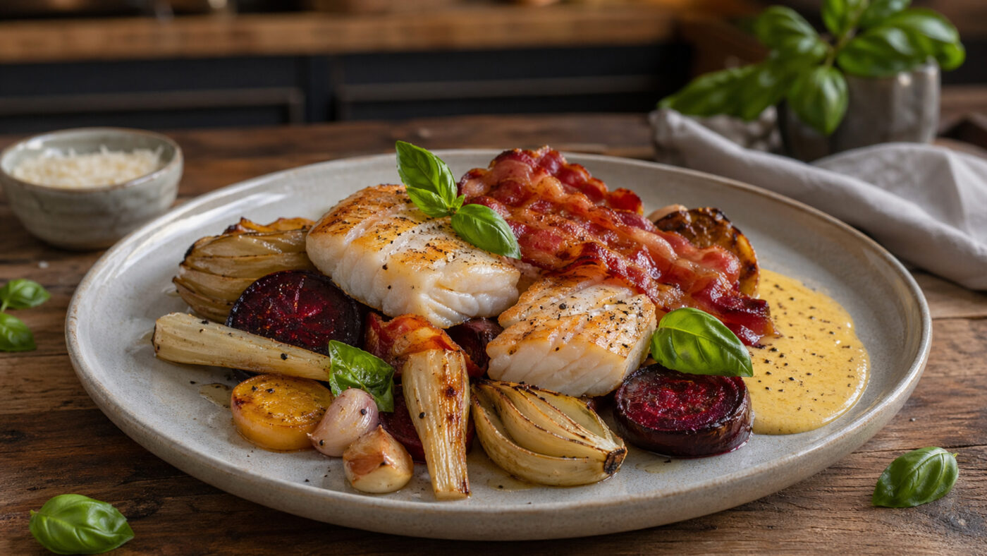 Prøv vår spennende variant av klippfisk; pannestekt med sprø baconskiver, parmesankrem og ovsbakte rotgrønnsaker. Bon apetit!