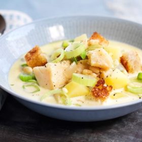 Lag en god kremet fiskesuppe med blant annet klippfisk, løk, purre og kremfløte.